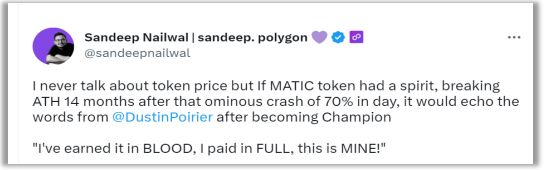 396. Polygon has explicitly encouraged MATIC purchasers to view MATIC as an investment in other ways. For example, in a February 5, 2021 tweet, 14 months after MATIC’s single biggest price drop, Nailwal compared the token to a prize fighter that came back from defeat to become a champion: